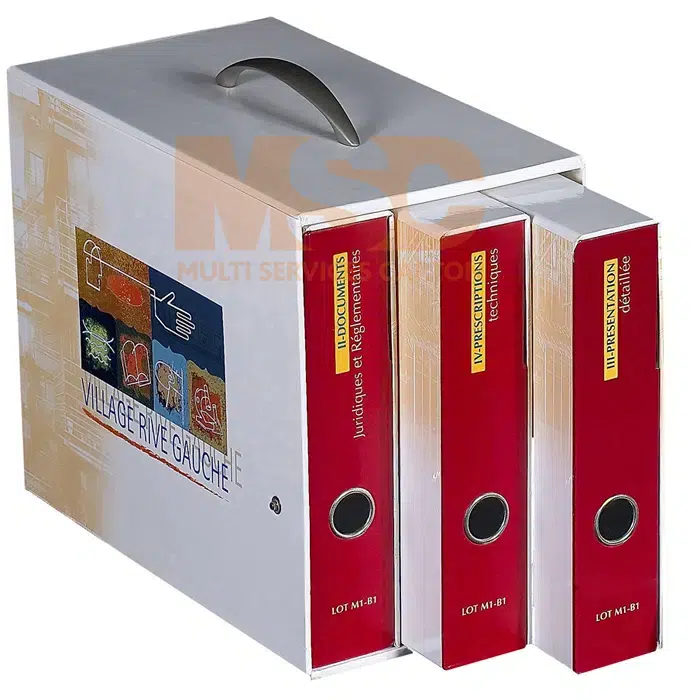 Les boites transferts, coffrets d’appel d’offres, classeurs et sabots sont livrés en volume.