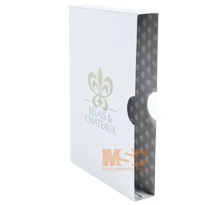 Pour votre etui livre en carton compact, votre visuel est imprimé sur un papier de création qui vient ensuite habiller votre boite carton.