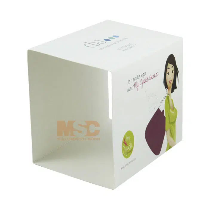 Il ne contient aucun système de fermeture, toutefois, il est possible d’intégrer des pattes intérieures de collage ou d’encliquetages. Sa fabrication est simple et économique.