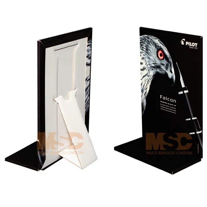 Le panneau anglésé sur de la cannelure. Cette technique permet de renforcer le carton pour un rendu plus solide, plus qualitatif tout en restant léger. Il est généralement utilisé pour de grands formats. L’épaisseur pourra de varier de 1 à 3 cm. Les tranches du panneau sont rembordés pour cacher la carton. L’impression est possible sur le recto/verso et peut être identique ou différente. Le panneau peut se maintenir debout soit par un chevalet, soit en diptyque (2 panneaux), soit en triptyque (3 panneaux). Il est possible d’intégrer un socle pour une meilleure tenue.