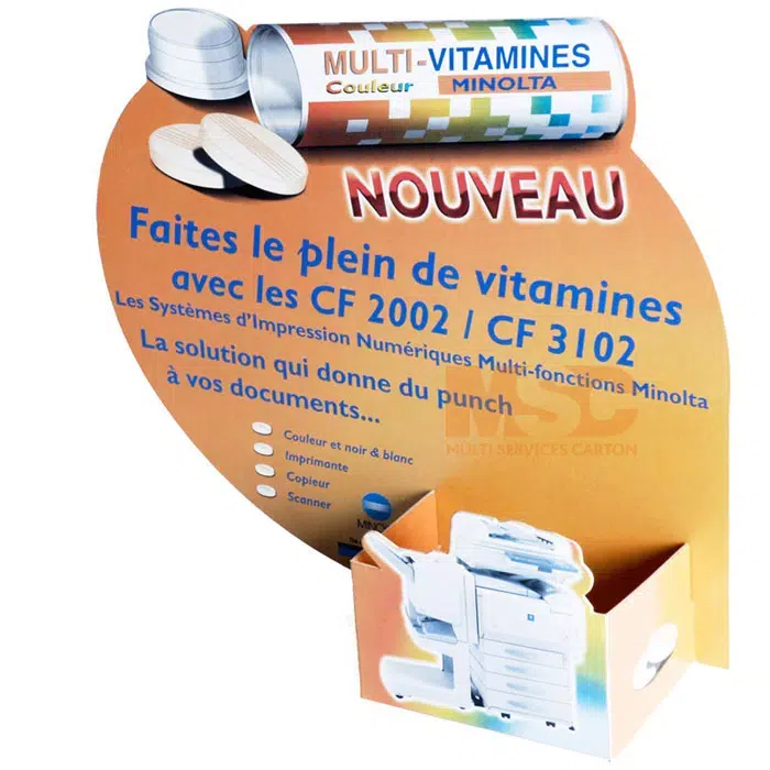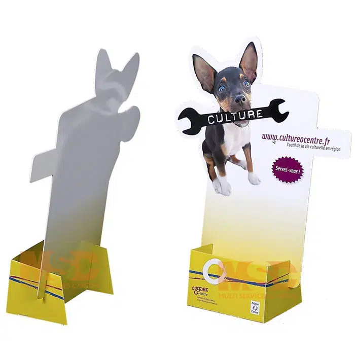 Il s’imprime sur sa totalité en recto/verso à l’identique ou différemment. Le verso sert généralement d’espace de communication destiné à mettre en avant les produits ou documents insérés dans le présentoir. Vous pouvez positionner des photos, du texte ou votre accroche client, l’impression est faite en quatre couleurs. Le verso peut servir de « pense bête » destiné au commerçant de façon à ce qu’il puisse aisément promouvoir les produits ou documents présentés.