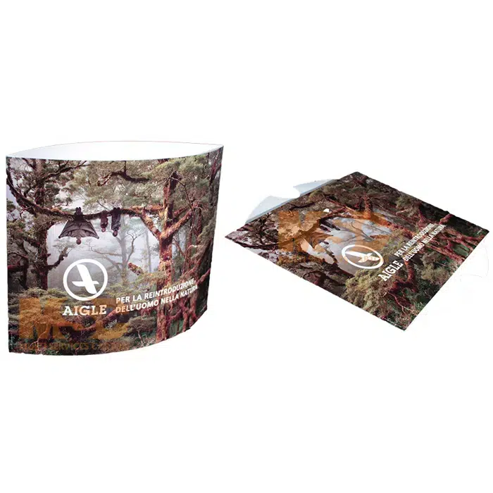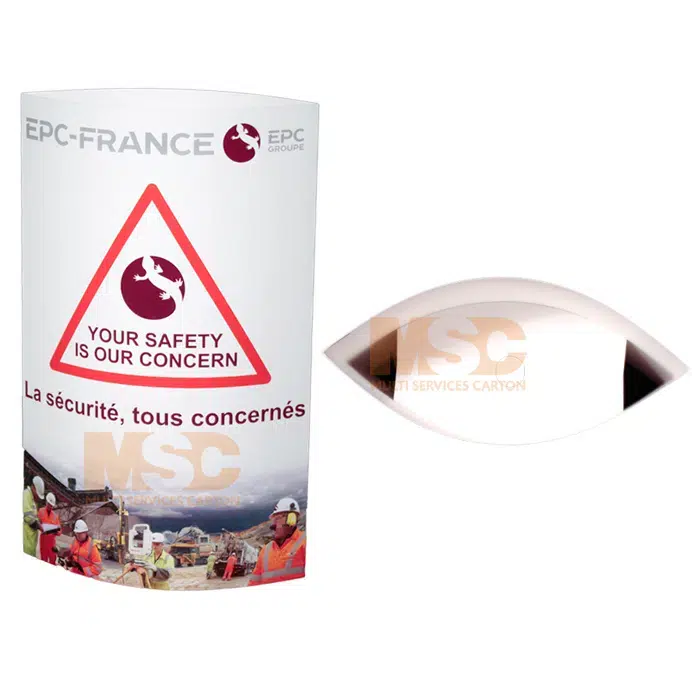 Léger et facile à monter, il existe en deux versions : le totem de comptoir et le totem de sol. Sa forme originale permet de se démarquer, et il est entièrement personnalisable, avec une impression sur les deux faces. Il peut également intégrer des tablettes, des fenêtres ou des pieds pour s’adapter aux besoins.